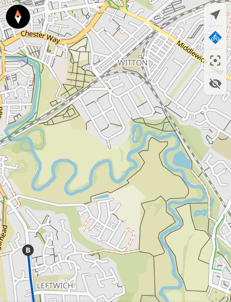 I end up in a place called Leftwich close to the river Weaver. Looking at the river on the map you can see how it got its name. Parts of it were apparently straightened in the 1700s to make it more navigable for canal boats.